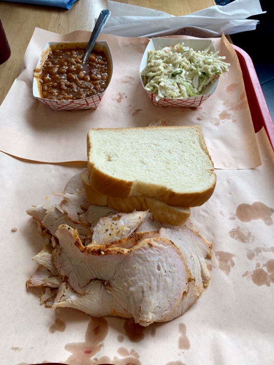 I’d amend the above to say that “Every Barbecue Day Is A Good Day”. We’ve made food trips to the “Pittsburgh of the South” (yes, that is one of their nick names) many times – most recently the fated thanksgiving weekend trip to Niki’s West, only to find they were closed for the holiday. Today, I found a great reason – we’ve made some new friends in another hobby circle and found that Birmingham was central for four of the couples to meet and eat. So I suggested a Sunday lunch and, “Hey, why don’t we go to Rodney Scott’s?” (I did call before we left Atlanta that morning to assure they weren’t closed for some reason, just to be safe.) My wife went with the barbecue staples, baked beans and cole slaw, and decided on the pit roasted turkey.
