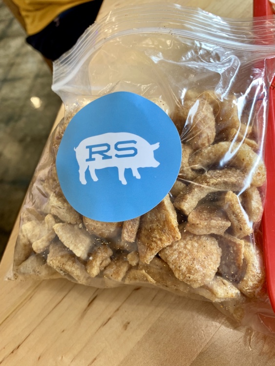 Was the pork as good as I remember. Yes – even though I did eat the last of that first pound, with pimento cheese on Myrtle Beach, this was as good. Mighty fine ‘cue. Definitely worth driving 100 miles for. Check out the smoke ring on the ribs. And what is barbecue without fresh pork skins?