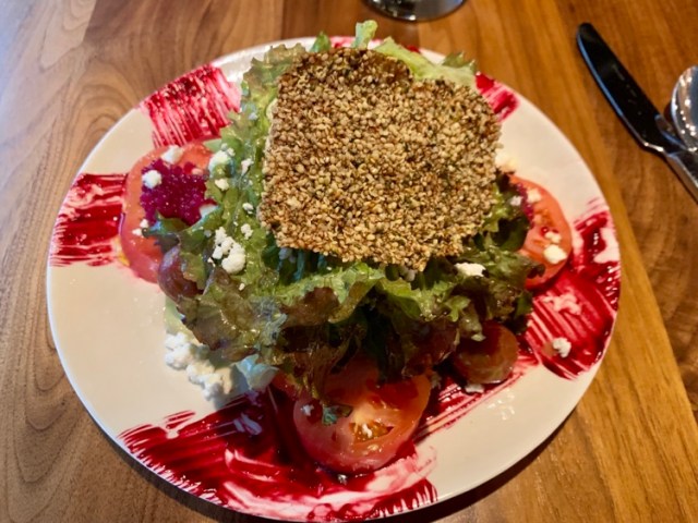 I started with a salad of mixed greens and heirloom tomatoes (they had me at heirloom tomatoes). It was tossed in a dill vinaigrette, topped with fresh goat cheese and served with a hemp seed cracker. Also in the salad were tiny pearls of tapioca, dyed with beet juice, served in bunches, like tiny grapes.