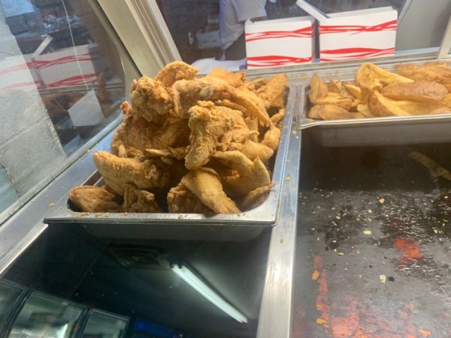 Several folks, in the reviews, rave about the burgers and the sandwiches. But I was there, specifically, for the fried things. I was looking for fried chicken (they only have legs thighs and wings), but as I waited for the thighs and wings to cook, this tray of pork chops, fresh from the fryer, caught my eye.