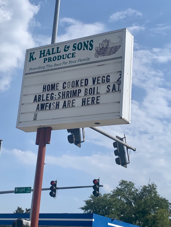 The pork chop and chicken were both excellent. I had originally planned to just sit in the car and eat, but then my beloved pointed out this sign.