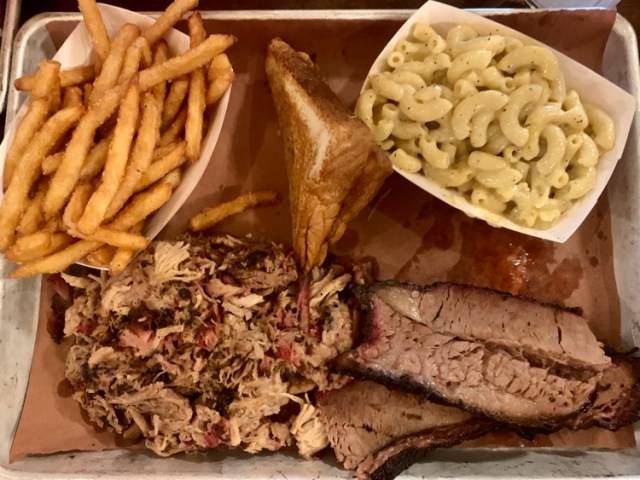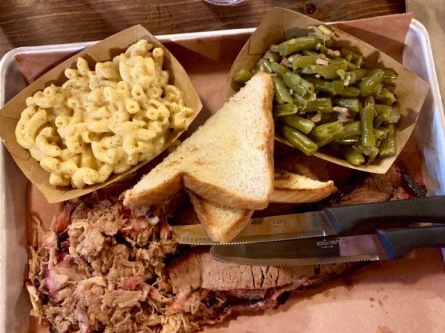 I think, at the table, we tried most all of these. The SOB, with habanero and jalapeño, was too hot for me – and I do like hot stuff. But I did REALLY like the japple- a mix of apples and jalapeño, which I thought was very good on the brisket. I ordered a combo plate: