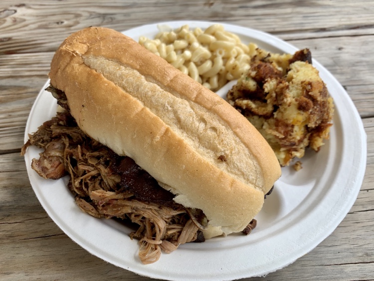 We were camping about an hour north of Asheville, with two other couples, so we decided that toward the end of the week, we would make the journey into town for lunch. I suggested 12 Bones Smokehouse and they were all in agreement. We verified that they were open (for carryout) and they had actually set up picnic tables in their lot where you could dine. My dear wife ordered a pulled pork sandwich, with cucumber salad and their smoked potato salad.