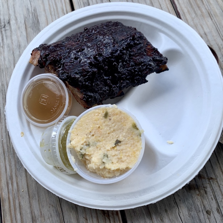 This was moist, smoky pulled pork, without a need for sauce. She also enjoyed the freshness of the cucumber and tomato salad, with a lite vinaigrette. I also ordered a side of ribs, to share and taste (with a side of jalapeno cheese grits).