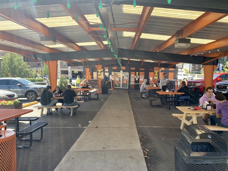 It’s a classic drive-in – in fact it is Indiana’s first and oldest, opened in 1929. It’s known for Triple XXX root beer (made since 1895), diner-style breakfasts and burgers. As we were there for lunch, we chose burgers. Mid-pandemic, we opted against eating on the patio (the inside was closed, at the time) and took our lunch back to the trailer to eat. I chose the “Boilermaker Pete”: