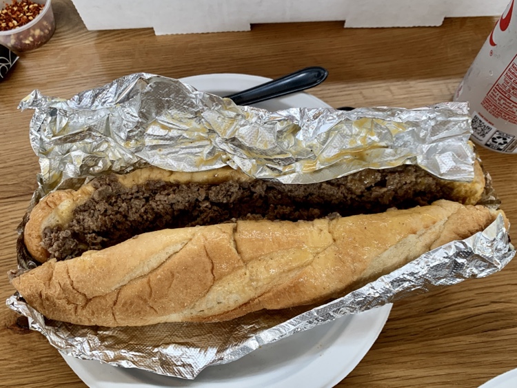 The choices are straight forward – either a ribeye or chicken sandwich with your choice of American, provolone, Cheese Whiz, mushrooms, peppers and onions. I went with a classic ribeye with whiz, paid the man and returned in about 15 minutes. The steak was very finely chopped and the cheese whiz had been kept so hot on the back of the griddle it was very then. The bottom of the roll didn’t hold up to the moisture, so this was a knife and fork sandwich. Were I to try one again, I’d go for one of the other cheeses.