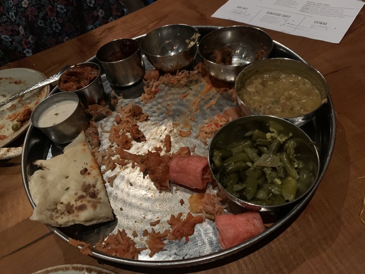 How can you go wrong with french fries, topped with chicken tandoori (as gravy) and cheese? You can’t. And we emptied the frying pan. And then came the thali: