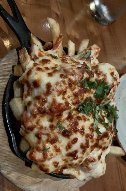 We talked with our server and she said that the thali was big enough to share, but we might want to order an appetizer. She suggested two – a whipped paneer, on which passed, and the chicken tandoori poutin, that we opted for.