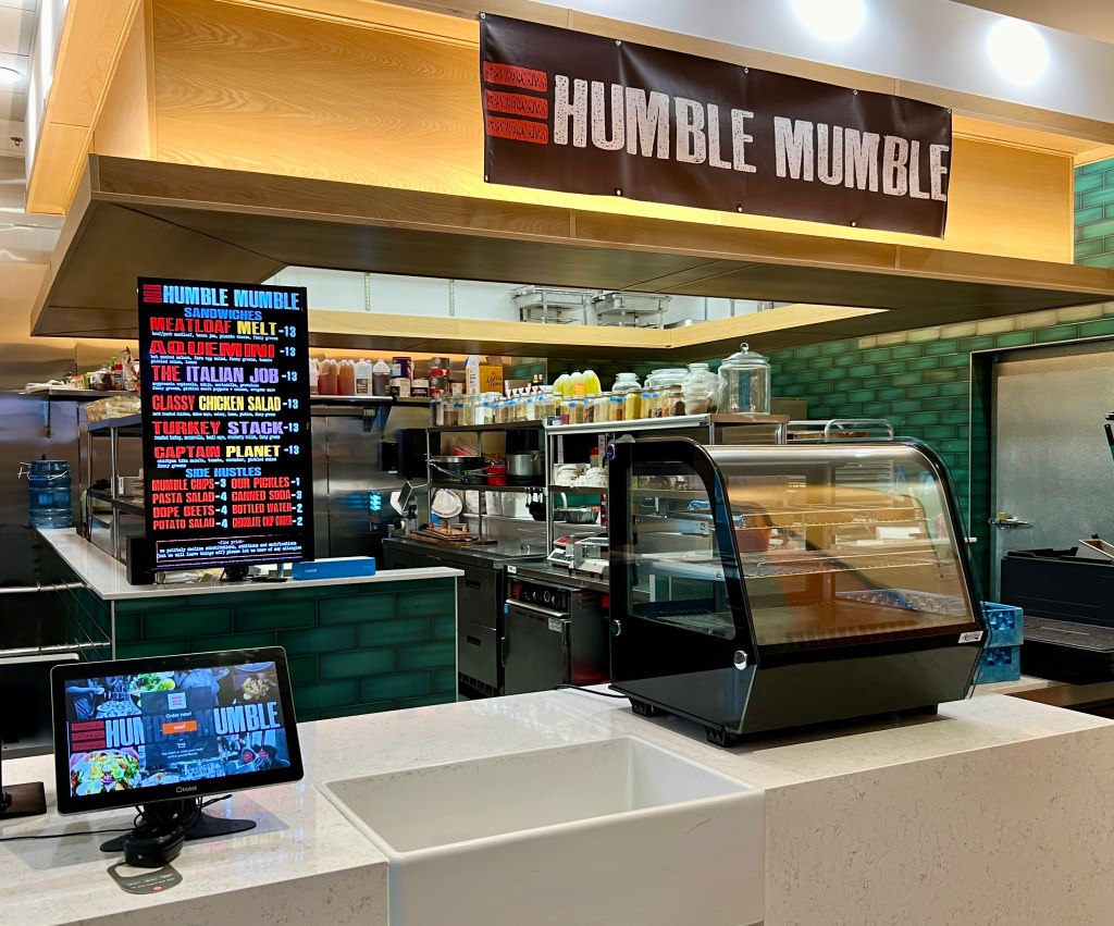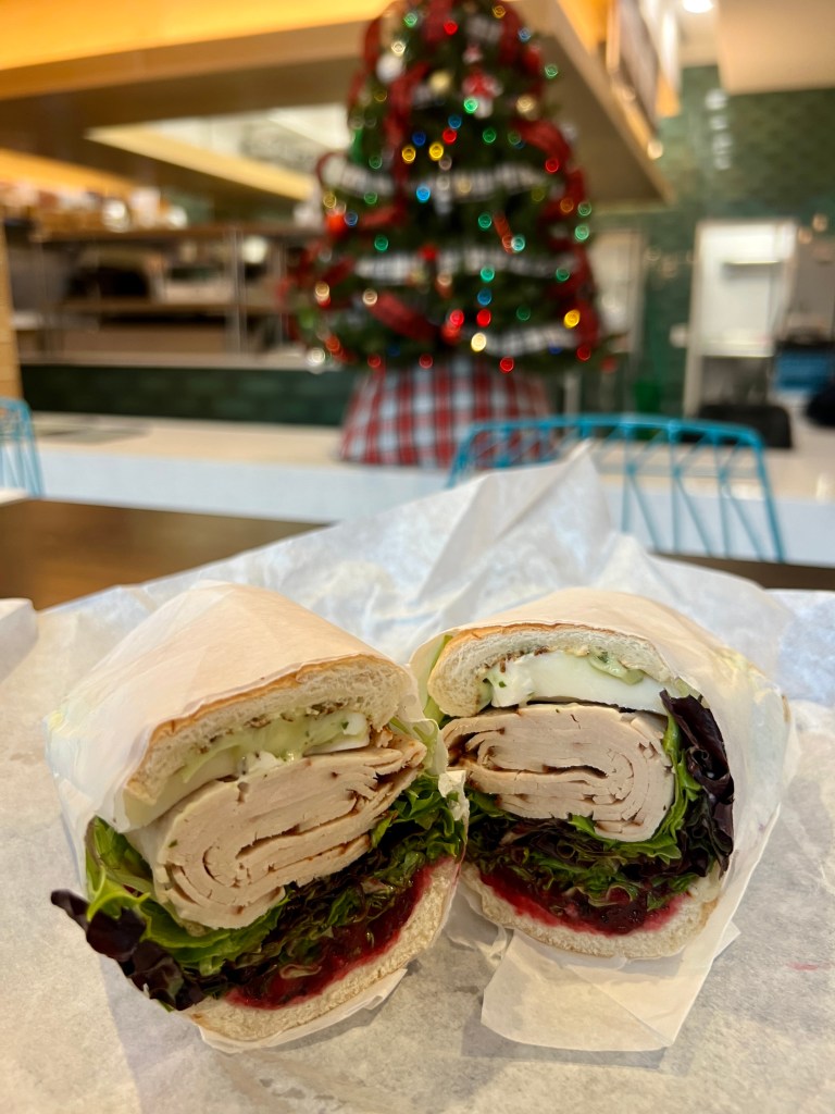 On the day after Christmas, at a near-deserted CODA Collective food hall, we made our way to Humble Mumble. Chef Justin Dixon‘s restaurant, named after his favorite Outkast song, had been on my radar, since seeing it on an eater Atlanta list of the best sandwiches in Atlanta. But they’re only open from 11 AM to 3 PM Monday through Friday. And that’s a time that I’m rarely downtown. After parking in the underground lot, I was afraid they werent open on Boxing Day (many of the restaurants housed there were not). But, thankfully, they were open. Chef told us it was slow today, and I believe that because at 12:15 we were order number two. My love chose the turkey stack – sliced turkey, mozzarella, cranberry relish, greens and a basil mayo on a toasted bun.