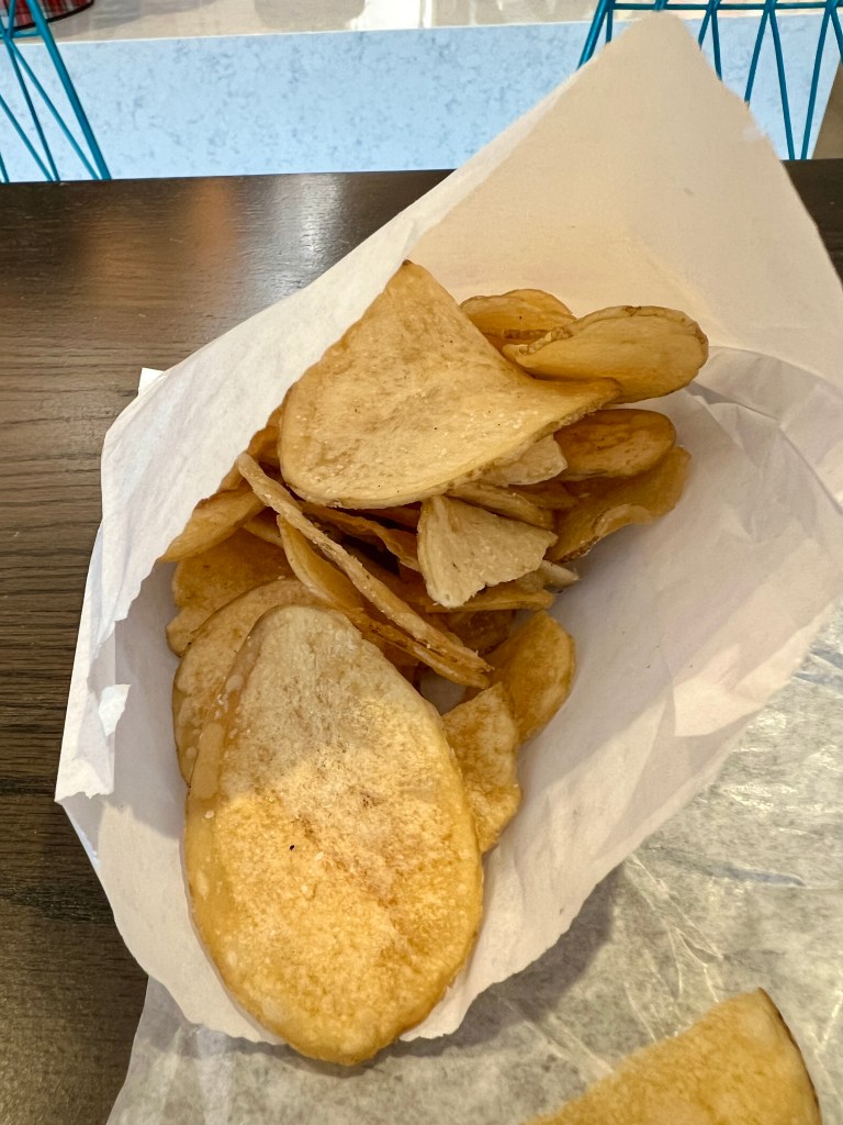 First, it was HUGE, as was my sandwich. And her sandwich was basically Thanksgiving on a bun. Very tasty and very hearty. We also shared an order of fresh fried chips, which were crispy and not oily at all, as chips too frequently can be.