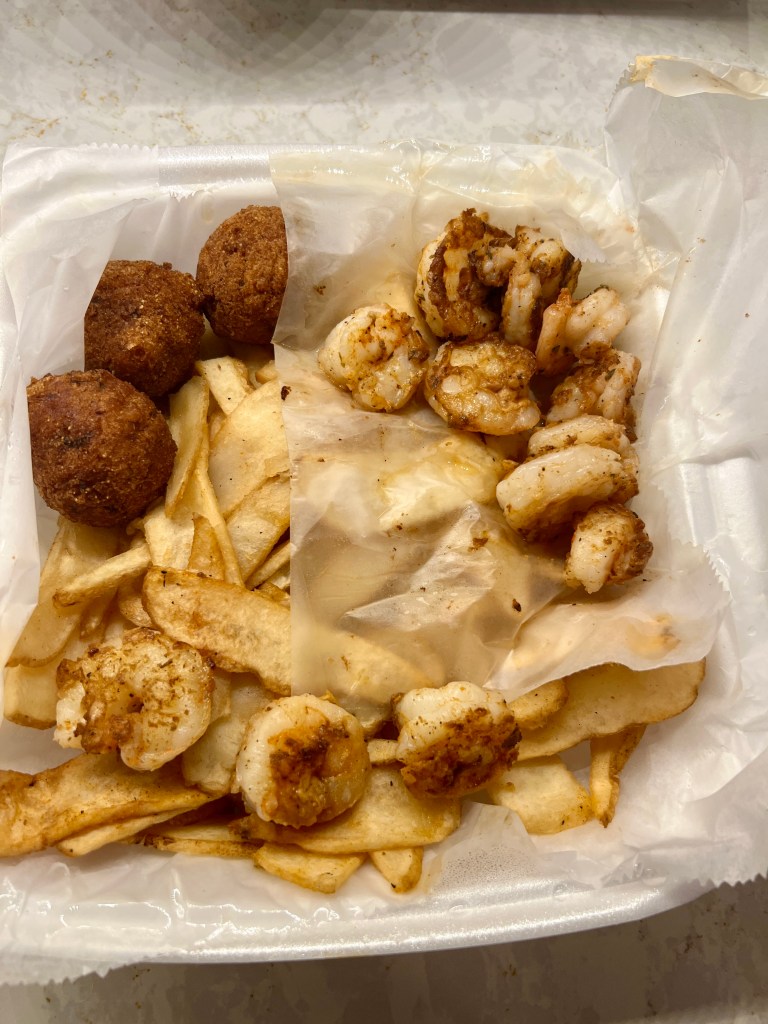 My dear wife chose the shrimp plate, which was offered grilled, blackened or fried, with jalapeño hush puppies, fries and slaw.
