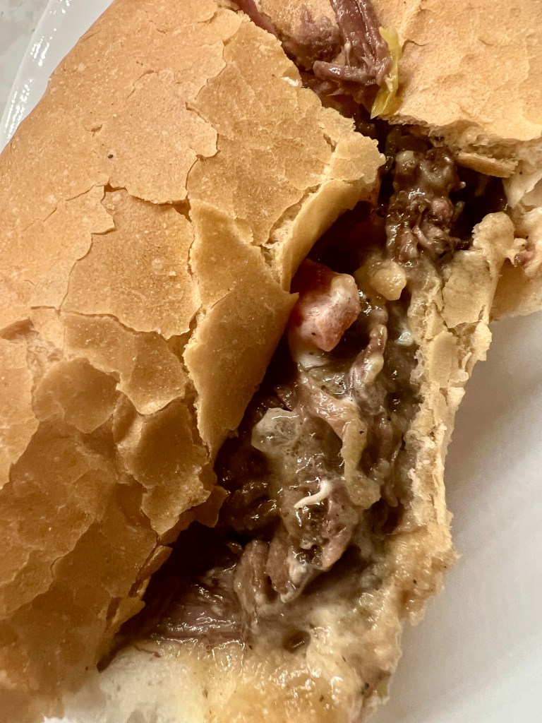I chose the po’ boy, known, colloquially, as ‘Debris’ – slow roasted beef, in gravy, usually with a horseradish sauce (with my long standing hate / hate relationship with horseradish, I omitted it.) This was the best roast beef Po Boy that I recall having eaten since ordering one from a gravel-parking-lotted trailer-housed restaurant named Sydney’s in Metairie, back in the early 1980s. The only downside was that, even with the excellent Leidenheimer roll, the 40 minute drive home allowed it to get just a little soggy.