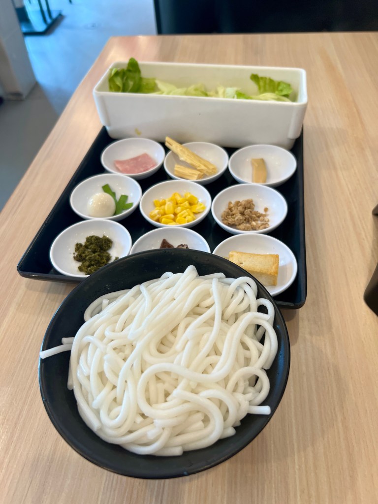 The menu and walls highlight their “crossing bridge” rice noodles. The legend of the name is that a wife prepared a meal for her husband by giving him a steaming bowl of broth with the noodles on the side to take with him. Then, after he “crossed the bridge”, at lunch time, he put the noodles in the hot broth and, by doing it this way, the noodles weren’t mushy. The modern version of this style of cooking involves a bowl of steaming chicken broth and oil into which cooked rice noodles and other things are poured. It’s kind of like “hot pot” or shabu shabu.