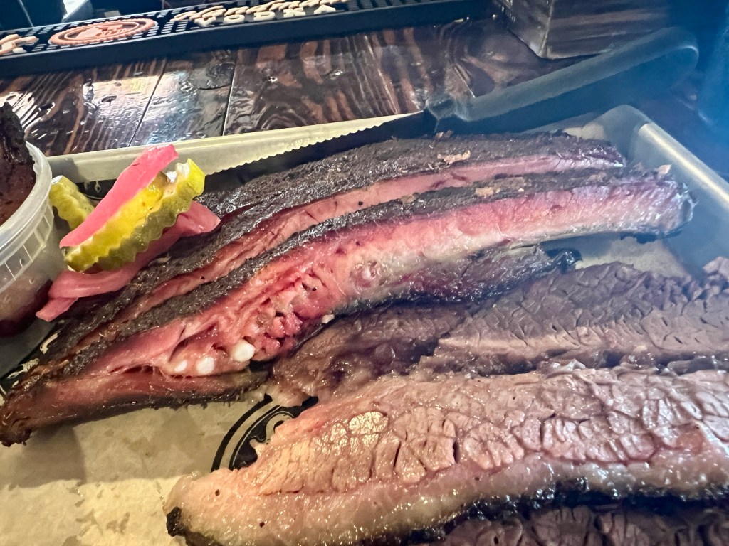 The interior is rather small, with a few booths and tables to the left of the hostess stand and the bar to the right, with a few high tops. But, there is a large patio outside. Open since 2020, pitmasters Justin Bradford and Jon Jaffin pride themselves on high quality smoked meats and inventive sides. I asked the (very) young lady behind the bar, where I had grabbed a seat what was best. She said the ribs and smoked wings were popular but the brisket was her favorite. So I chose a two meat combo – ribs and brisket, with mac n cheese and plantains (maduros).