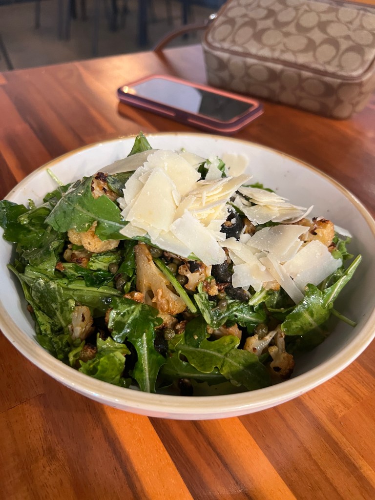 We stopped in on a late Saturday afternoon during football season and the crowd had not picked up, yet. It was quiet and that gave the server a chance to talk about the choices. My beloved asked some questions about the salad choices and chose one with roasted cauliflower, arugula, black olives, capers and Parmesan with a lemon oil dressing.